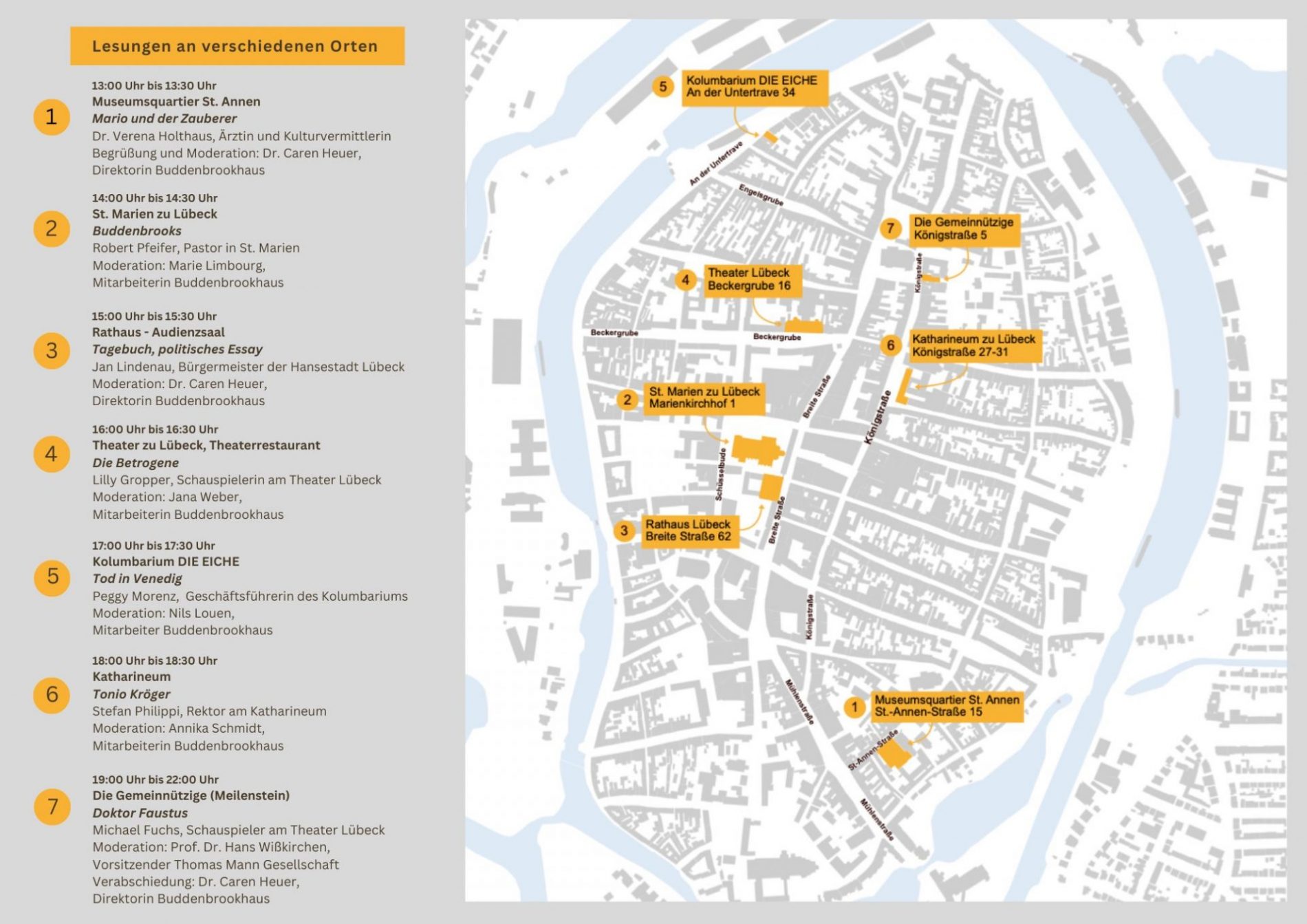 Sieben bekannte Lübecker Persönlichkeiten lesen an sieben besonderen Orten der Altstadtinsel, die eng mit Leben und Werk des Nobelpreisträgers verbunden sind – aus sieben verschiedenen Werken.